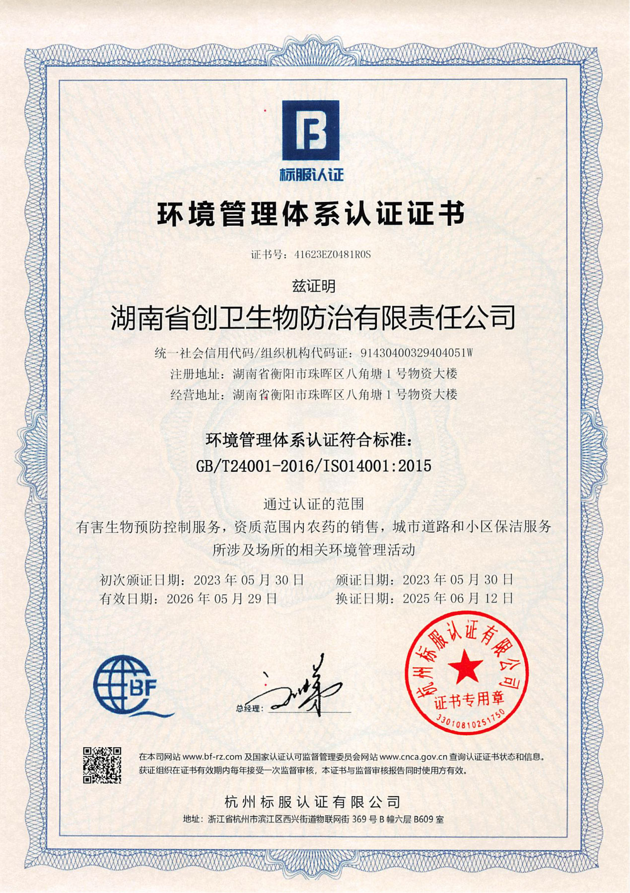 环境管理体系认证证书